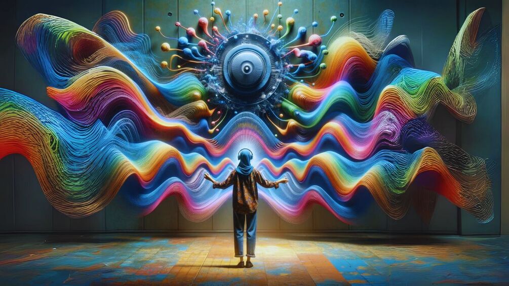 "Vibrant Echoes: A Deaf Experience" captures the essence of an image that bridges the gap between the auditory and visual realms. The artwork features a person with a sense of wonder, standing before an explosion of colorful waves that represent sound and energy. This person, a member of the Deaf community, is portrayed as fully immersed in the sensory experience, suggesting that the perception of sound isn't confined to hearing alone. The waves symbolize the vibrations that can be felt, seen, and experienced, transcending the conventional boundaries of sound. This title and image together celebrate the multidimensional ways in which the Deaf community can connect with and enjoy the vibrational qualities of sound.
